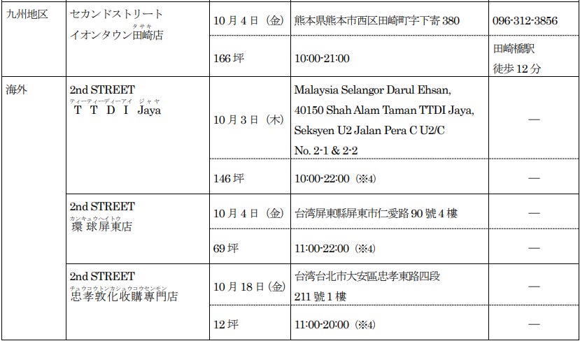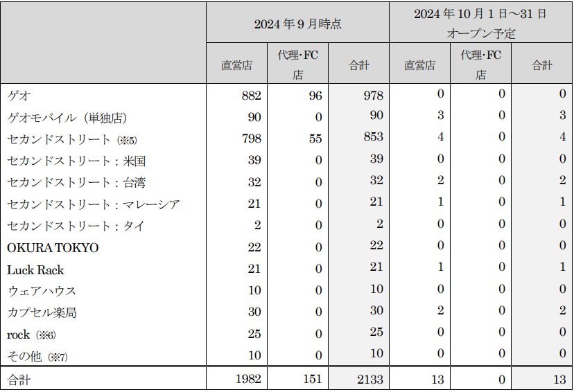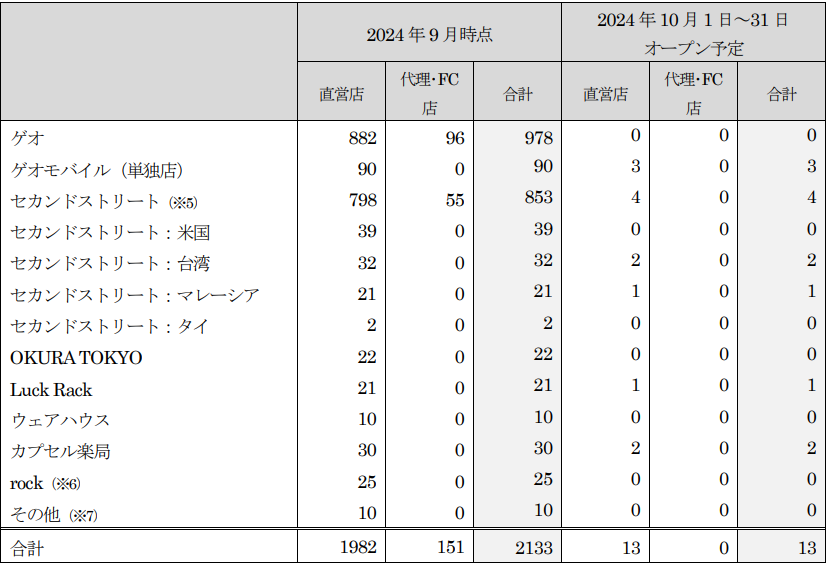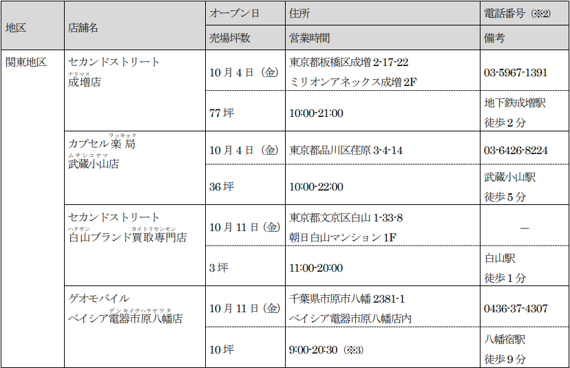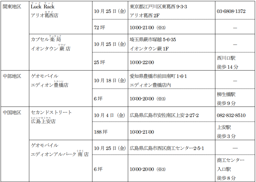 新たに「セカンドストリート」7店舗、「ゲオモバイル」3店舗、「ラックラック」1店舗、「カプセル楽局」2店舗の合計13店が2024年度10月度にオープンします。