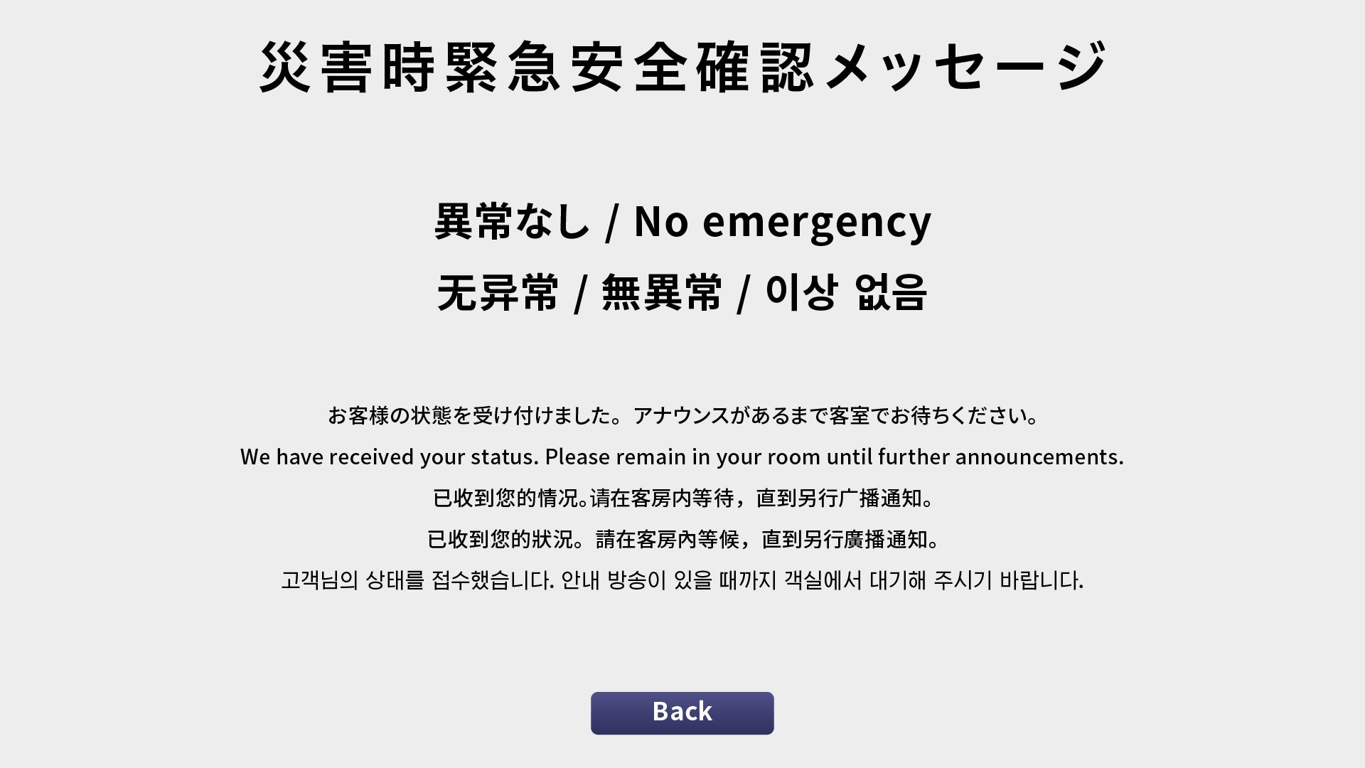 客室テレビへ緊急案内を強制表示し、宿泊者の安否状況を“見える化”!