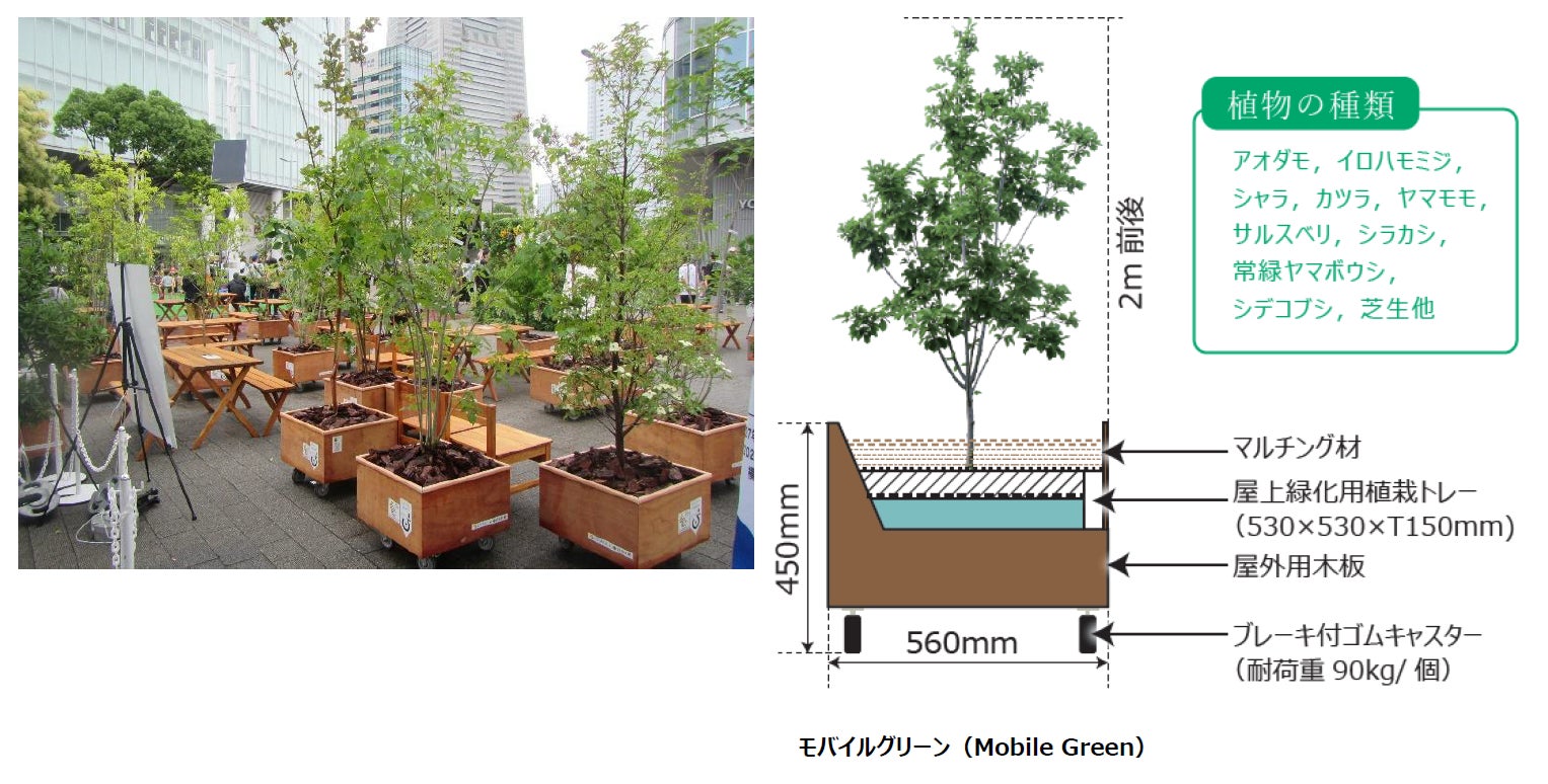 ・地球レベルでの気候変動対策や、子育て・高齢者対策の一環として、緑の木陰やうるおいある景観など、緑の効用を活(い)かした「都市緑化」の重要性が高まる中、これまで緑化が困難だった駅前広場や空き地、駐車場、地下通路などの空間を暫定的な緑地として活用する新しい緑化手法として、住友林業株式会社により開発された自由に「動かせる緑」のことです。