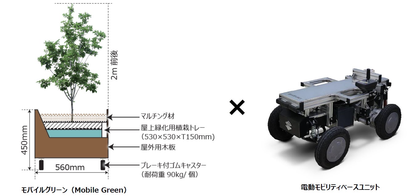 ・植栽の部分は、日本の伝統技術である『盆栽』に着想を得て、屋上緑化で使われる軽量・薄層の植栽基盤を用い「通常は重くて動かせない樹木にもかかわらず、手軽に動かしてどこでも木陰をつくることができる」もの。