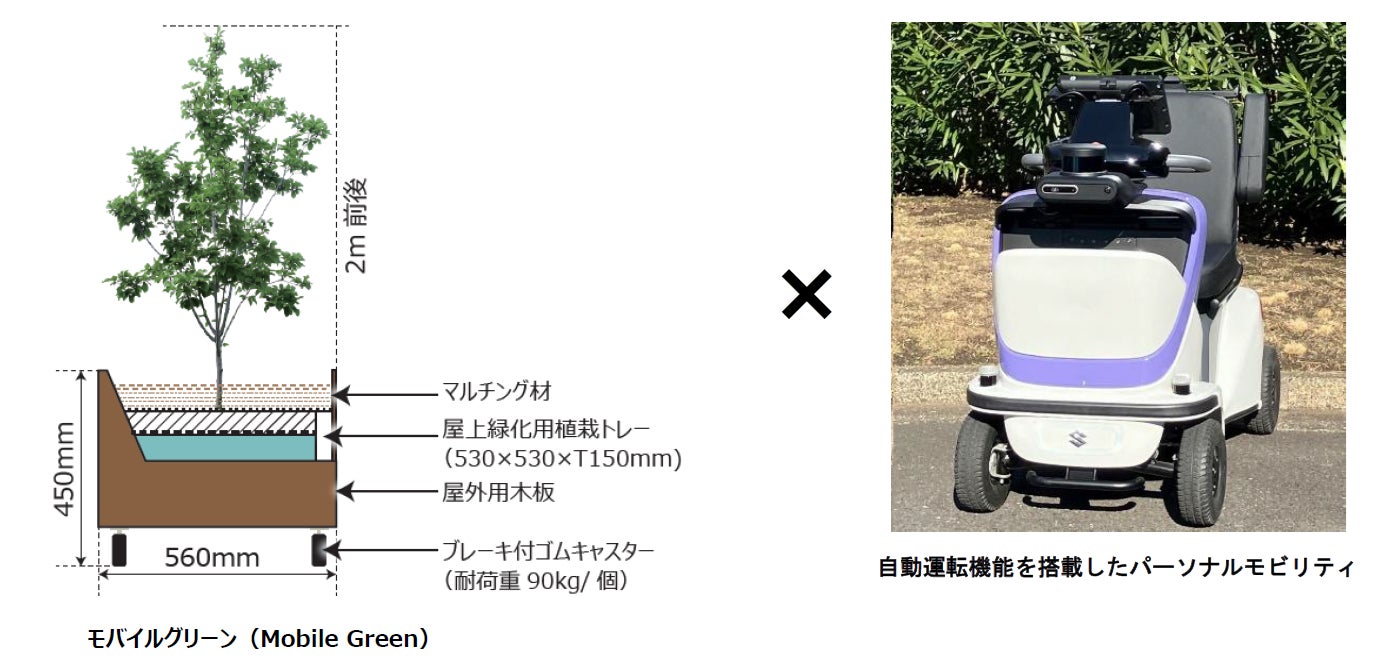 全国都市緑化かわさきフェアでは、スズキ株式会社が市販する電動車いすに自動運転機能を付加した開発車両を、動く緑のコンセプトを示せるよう台車風にカスタマイズしたモビリティとして展示いたします。