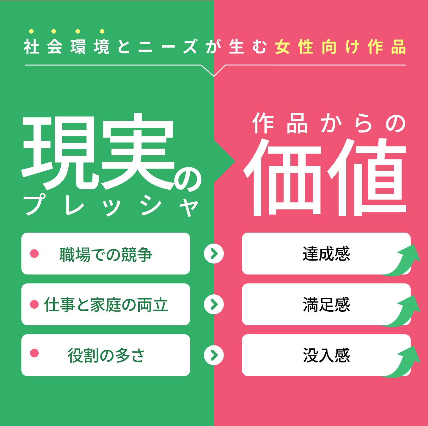 本特集「創作環境とトレンドの分析」では、女性向け作品のヒット要因について、以下の観点から整理しています。