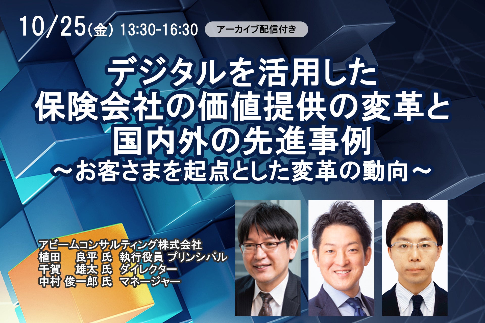 講師には、アビームコンサルティング株式会社 執行役員 プリンシパル 植田 良平 氏、ダイレクター 千賀 雄太 氏、マネージャー 中村 俊一郎 氏を迎え、保険業界におけるお客さまへの価値提供を変革するためのデジタル活用のあり方を、アビームコンサルティングが実施している独自の調査結果や国内外の先進事例を用いて解説していただきます。