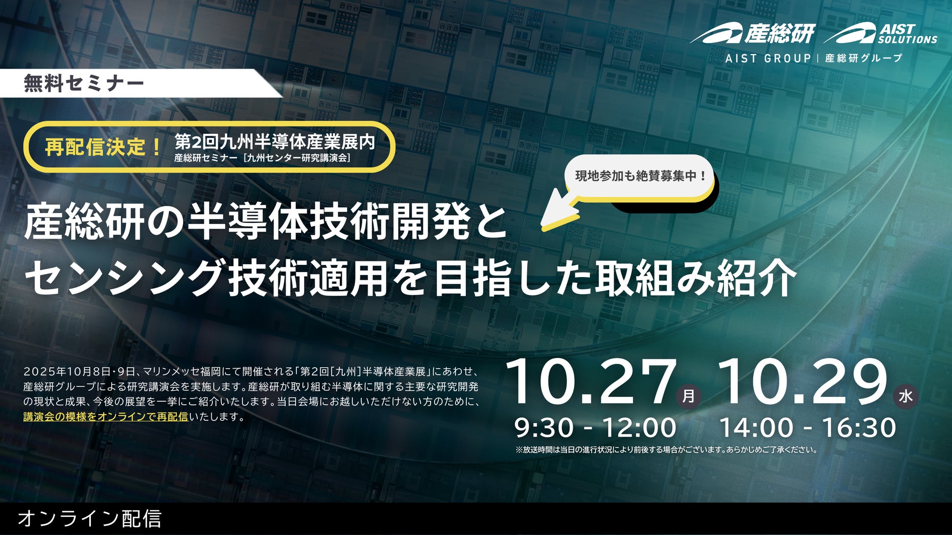 なお、本セミナーは、2025年10月9日(木)にマリンメッセ福岡 B館セミナー会場B1にて行われる「産総研セミナー[九州センター研究講演会]」のプログラムの一部をオンラインで配信するものです。