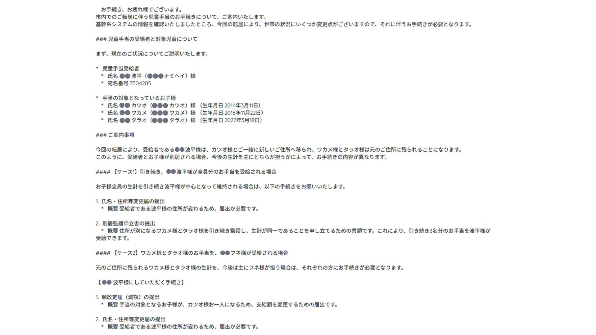AIに渡している総合行政システムのデータは、<世帯員の個人情報><児童手当の資格情報>のみです。ここに、どの様に世帯が分離したのかという情報から二つの世帯に対してご案内するべき事柄を窓口職員として案内するようAIに指示をしています。