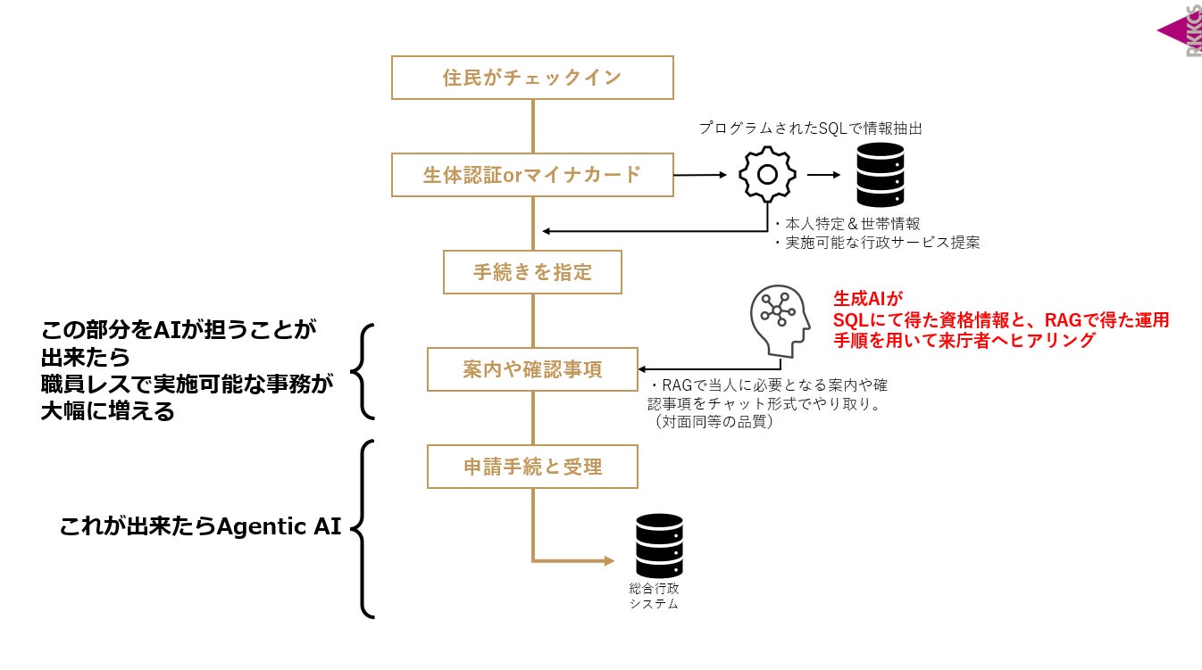 当社は今年4月に提供を開始した生成AI型マニュアルシステム「おとなりさん」や、今年1月に宇和島市でデジタル庁が主催したAIアイデアソンから生まれた「基幹系データベースと生成AIとの融合」をテーマとして制作したモックアップをご紹介しました。総合窓口の現場で職員レスを実現するために、業務担当職員によるご案内が必要な事務をAIが代替する流れを想定した試作品です。総合行政システム(基本データリスト)から、対象者の個人情報および資格情報を抽出し、その内容と予め学習させておいた法律や業務手続きに関する内容を組み合わせ、生成AIが窓口に来た住民に対して必要なご案内事項に対応するという仕組みになっています。