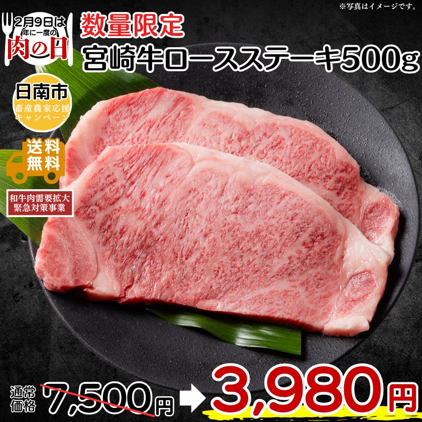 【2/9限定送料無料】〈日南市産〉宮崎牛ロースステーキ2枚500g