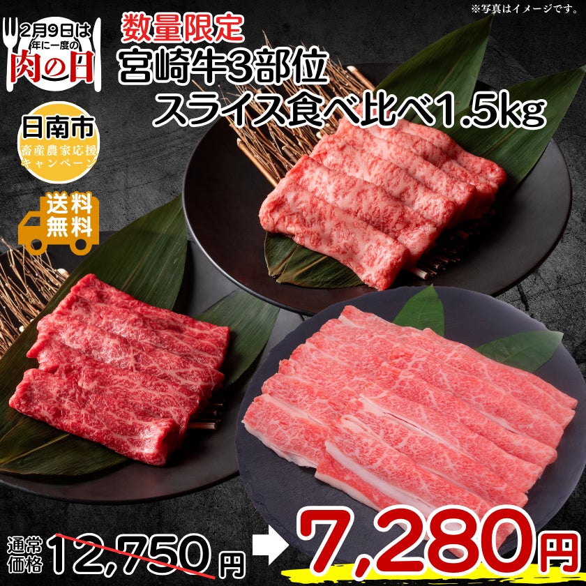 【2/9限定送料無料】〈日南市産〉宮崎牛3部位スライス食べ比べ計1.5㎏