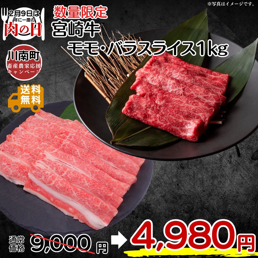 【2/9限定送料無料】〈川南町産〉宮崎牛モモ・バラスライス計1㎏