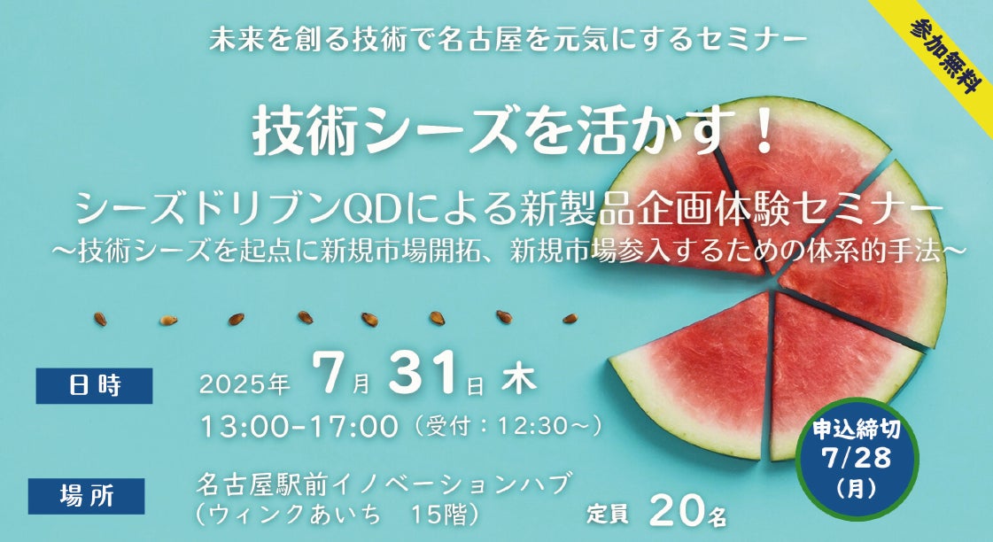 7月31日(木)未来を創る技術で名古屋を元気にするセミナー 技術シーズを活かす!シーズドリブンQDによる新製品企画体験セミナー ~技術シーズを起点に新規市場開拓、新規市場参入するための体系的手法~