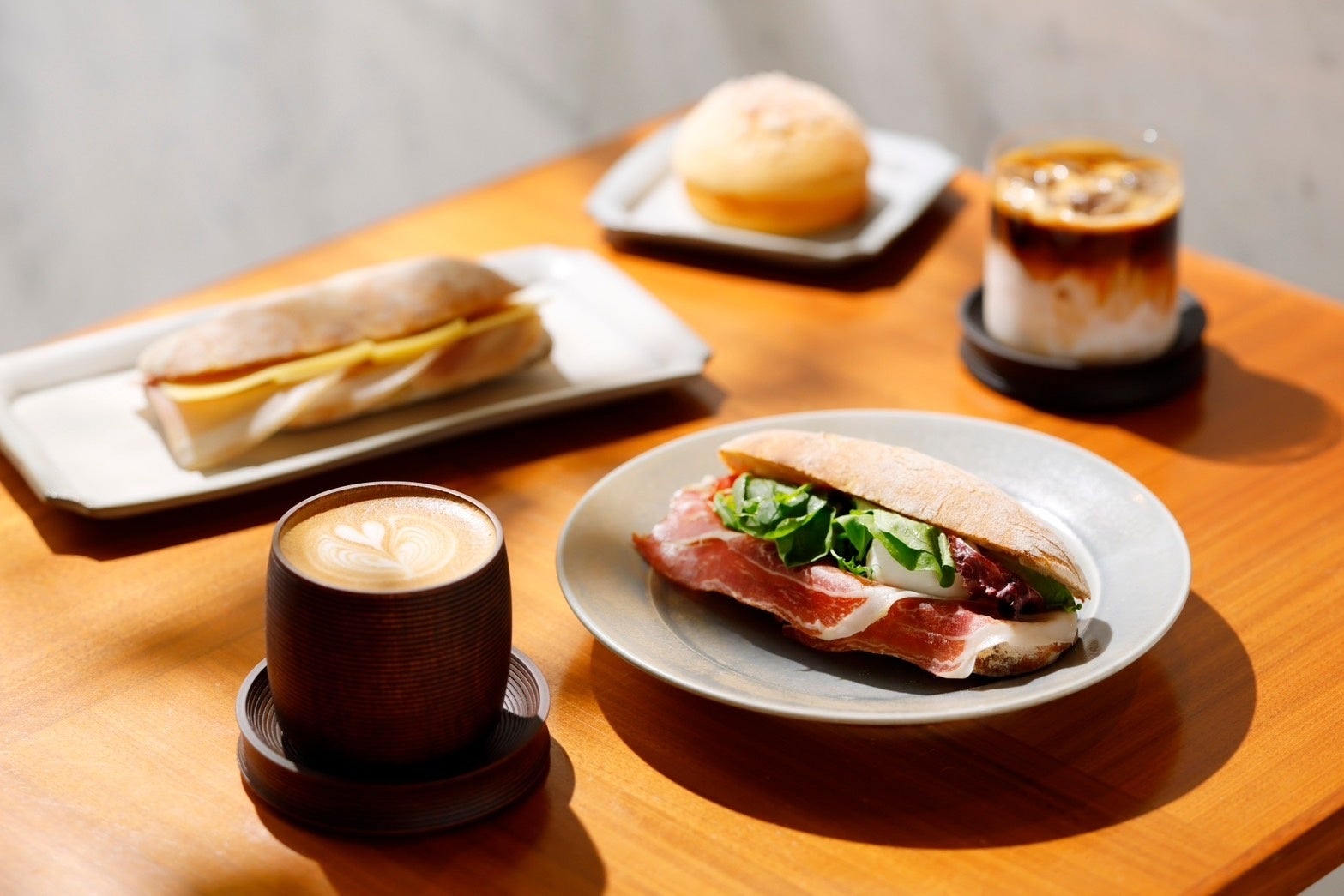 カフェフロアでは、野々市市の名店「NiOR」が手がけるこだわりのバゲットサンドイッチや、金沢の自家焙煎珈琲店「SUNNY BELL COFFEE」をはじめとする3社のこだわり豆を使った香り豊かなコーヒー、石川県産の加賀和紅茶、濃厚な抹茶・抹茶ラテなど、豊富なドリンクメニューをご提供しています。器には、伝統工芸の山中漆器を手がける「我戸幹男商店」の漆器を採用し、味覚だけでなく、視覚や触覚でも楽しめるひとときを演出しています。