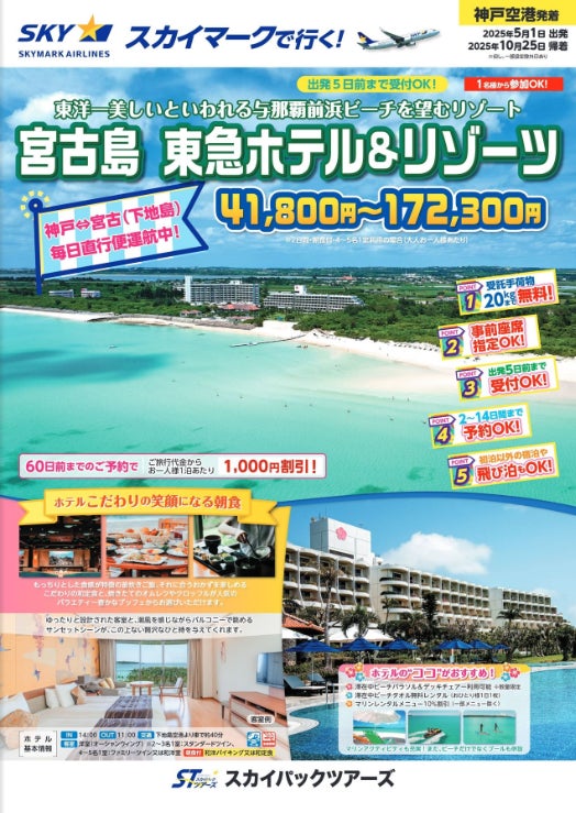 スカイパックツアーズ株式会社(本社:東京都中央区、社長:横山正巳)は、スカイマークを利用した価格固定型のパンフレット旅行商品「スカイマークで行く!宮古島 東急ホテル&リゾーツ」【神戸空港発着】(2025年5月1日出発~10月25日帰着)の販売を開始します。