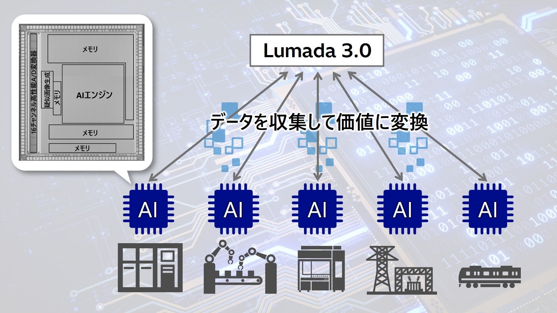 株式会社日立製作所(以下、日立)は、お客さまの課題解決や持続的な成長に貢献する価値の創出をめざして、Lumada 3.0の現場適用を強化するエッジAI*1技術を開発しました。本技術は、画像・音・振動など多様なセンサーデータの処理を一つの半導体チップに高密度に集積し、省電力かつコンパクトな実装を実現しています。さらに、先端システム技術研究組合(RaaS)*2が提供する設計試作環境を活用することで、同程度の処理速度のAI半導体と比較して消費電力を約1/10に抑えることに成功しました。これにより、電源供給や設置スペースに制約のある現場でも、エッジAIによるリアルタイムデータ解析が可能となり、設備の安定稼働や生産性向上、品質管理の高度化を実現します。今後、日立は、半導体製造を行うパートナー企業との連携などを通じて、本技術を自社の検査装置や外観検査ソリューション*3などに展開し、デジタライズドアセットの価値向上をめざします。これにより、現場で収集したデータを価値へと変換し、産業分野や社会インフラの高度化と持続的な成長、社会価値の創出に貢献します(図1)。また、大規模なシステムで活用されるGPU*4などのAI半導体と、現場に最適化した本技術を組み合わせることで、クラウドから現場まで一貫したAI処理基盤を提供し、幅広い社会課題の解決をめざします。
