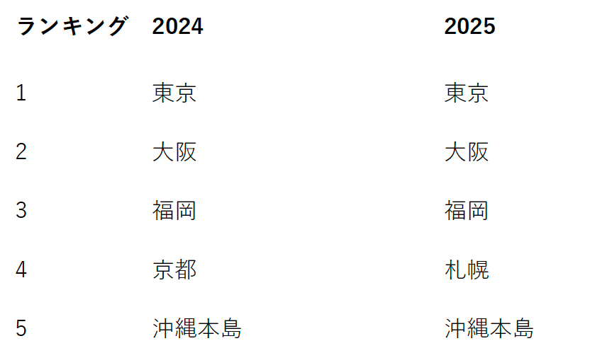2025年の冬旅検索では、前年に続き 「東京」「大阪」が1位・2位を維持。 一方で、地方都市の人気が依然として高いことも特徴として見られました。 特に福岡・札幌・沖縄本島 の3都市がランクインしており、冬のイベント需要が旅行検索を後押ししたと考えられます。