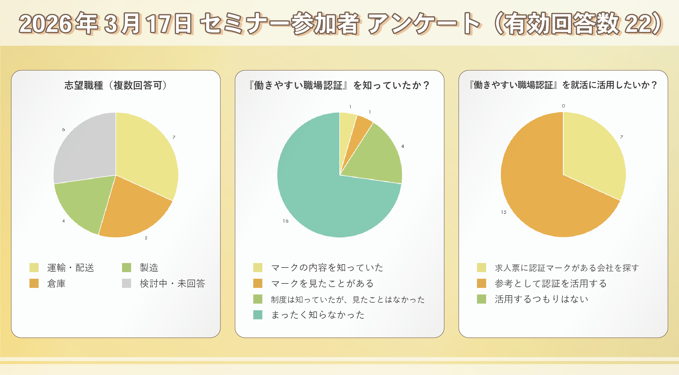 運輸・配送・倉庫業を希望する求職者の割合は25%で、検討中・未回答(48%)を除けば最も多く、当セミナーへの関心の高さが示されました。