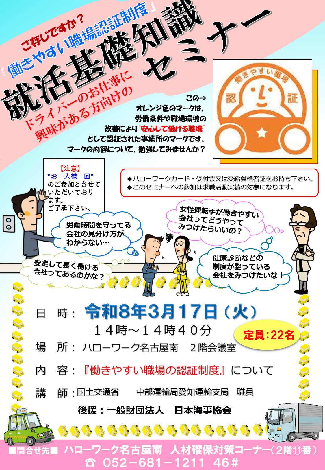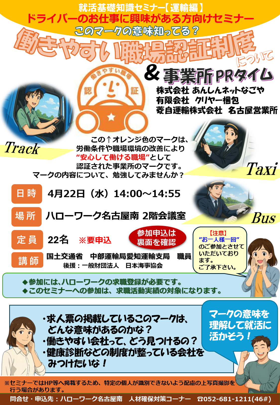 このセミナーは、ハローワーク名古屋南、国土交通省中部運輸局、愛知運輸支局および働きやすい職場認証制度事務局が協力し、2022年12月から定期的に開催しているものです。