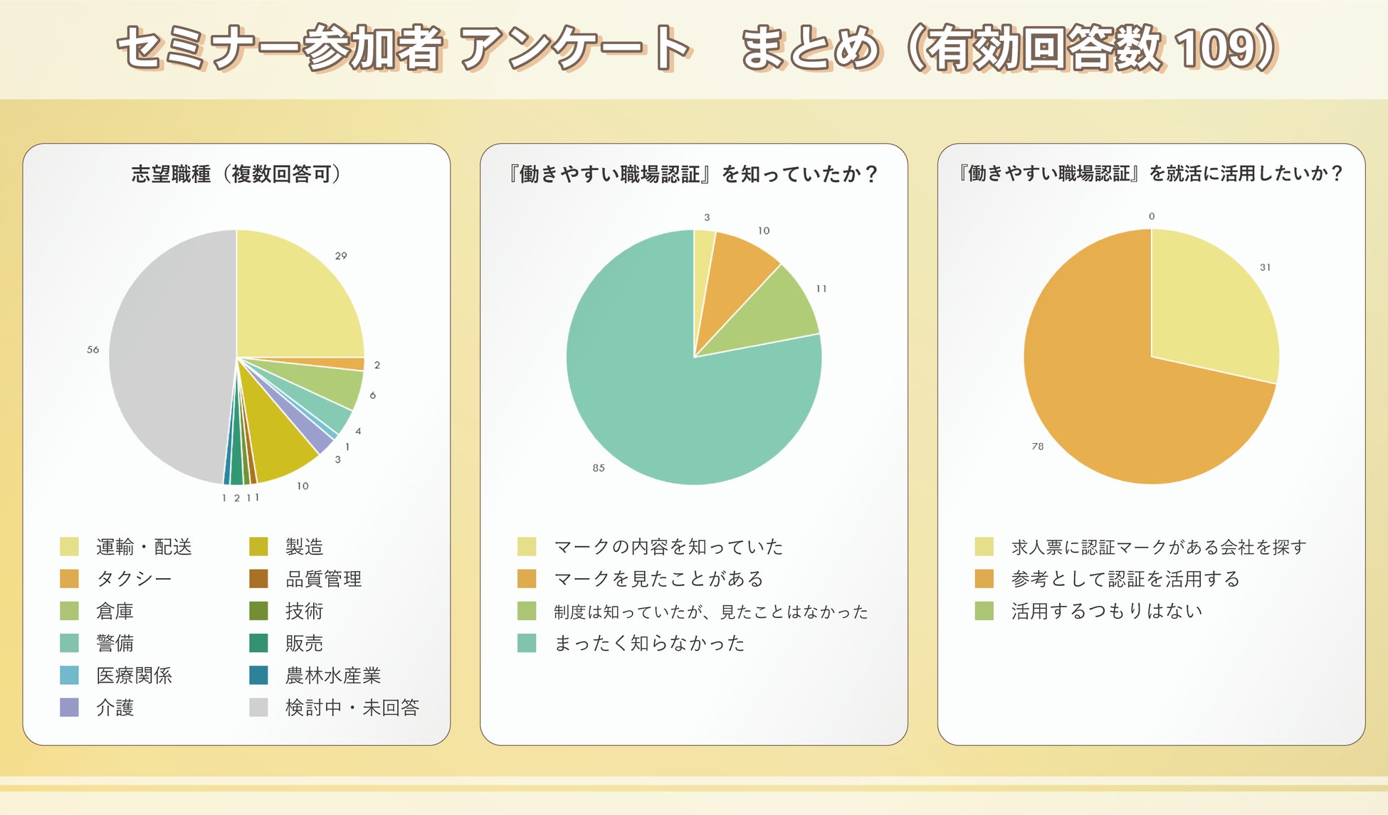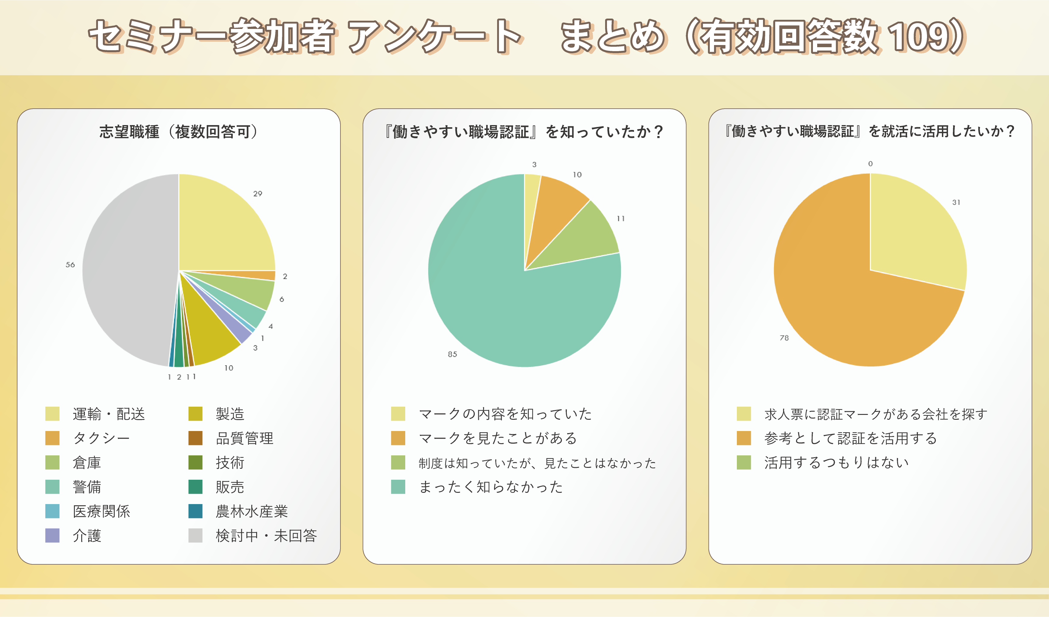 しかし、セミナーで認証の説明を受けた後は、志望職種が異業種である求職者や検討中の求職者を含め、100%が「就職活動の参考にする」と回答しており、求職者の意思決定に寄与することが明らかになりました。