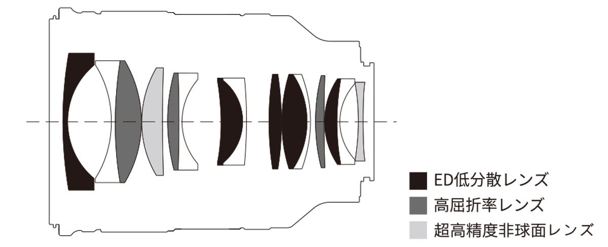 (EDレンズ5枚、高屈折率レンズ3枚、非球面レンズ2枚)