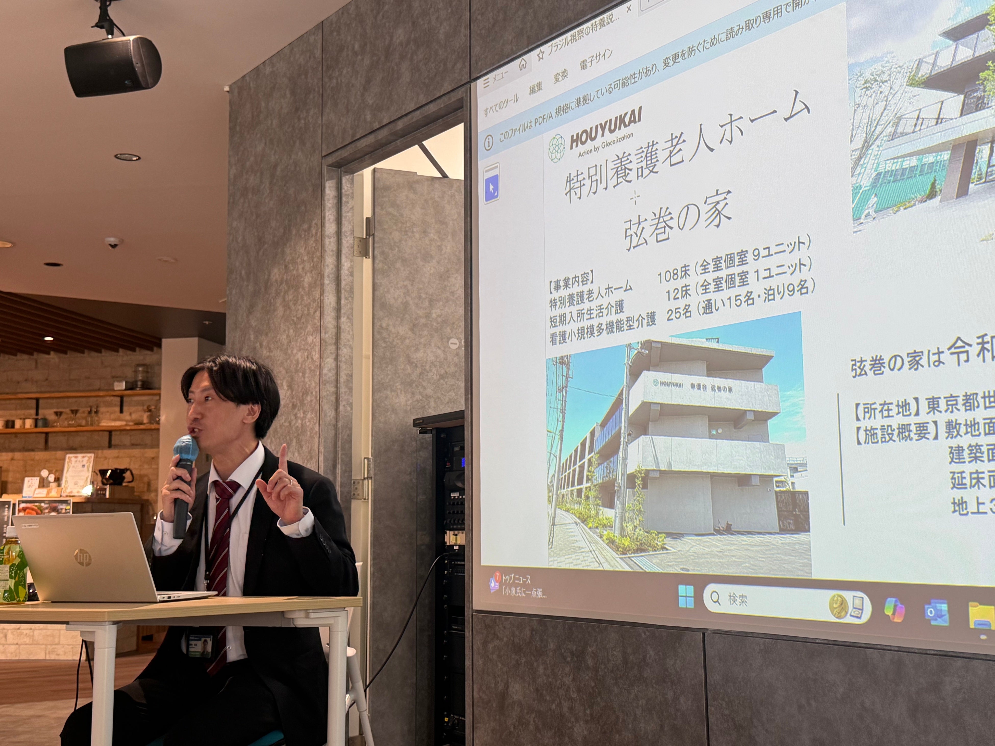 名刺交換と自己紹介の後、奉優会より法人理念や事業概要、特別養護老人ホーム「弦巻の家」および併設する看護小規模多機能型居宅介護事業所「優っくり看護小規模多機能介護 弦巻」の特徴についてご説明しました。