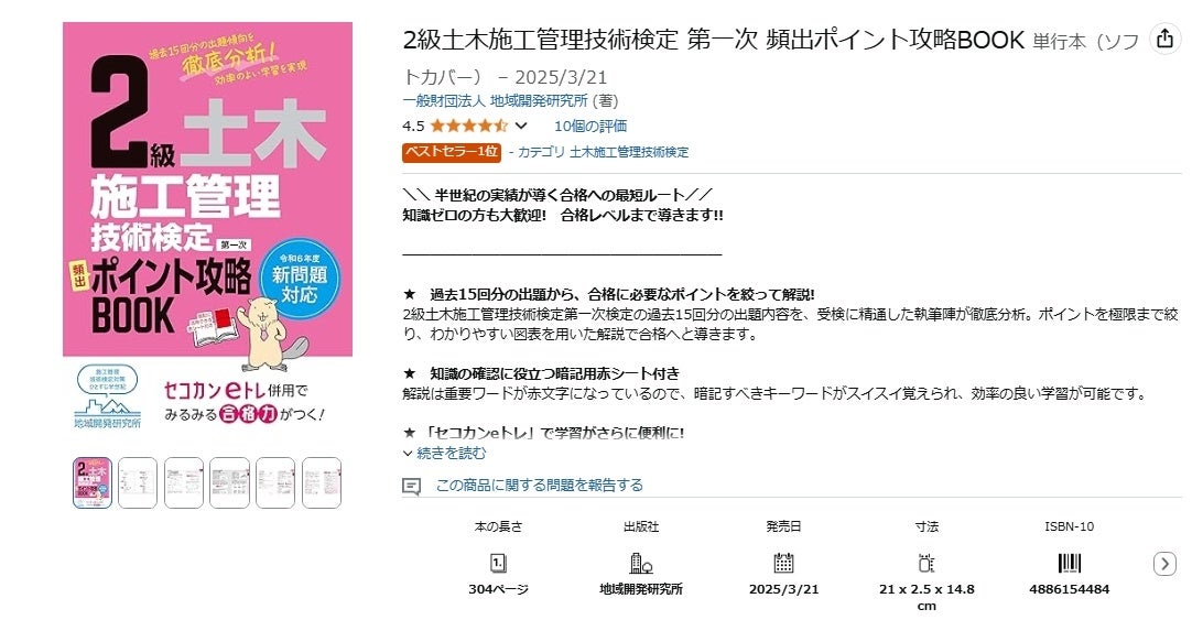 一般財団法人 地域開発研究所(東京・文京区/理事長:青柳一郎)が2025年3月21日(金)に発売した『2級土木施工管理技術検定 第一次 頻出ポイント攻略BOOK』が、2025年7月15日(火)付けのAmazonランキングの「土木施工管理技術検定」部門で1位を獲得しました。