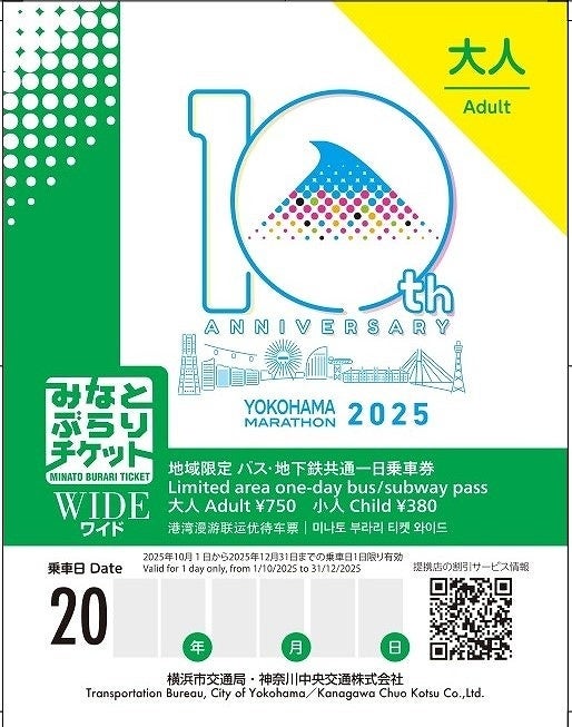 横浜マラソンのフルマラソン化10周年を記念し、横浜市交通局と連携して、横浜マラソン特別デザインの観光一日乗車券「みなとぶらりチケット」を販売しています。エリア内の市営地下鉄、市営バス・神奈中バスが乗り放題になるほか、チケット提示で、200を超える施設・店舗で割引などの特典を受けられます。
