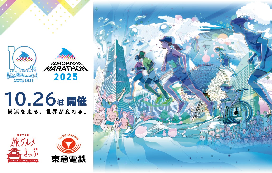 フルマラソン化10周年を迎えた横浜マラソンは、10月26日(日)に「横浜マラソン2025」を開催します。10月は「横浜マラソン月間」として、大会開催に向けて、ランナーの皆さまをはじめ、観戦、応援の方々にも、大会や横浜のまちをお楽しみただけるような取組を進めます。