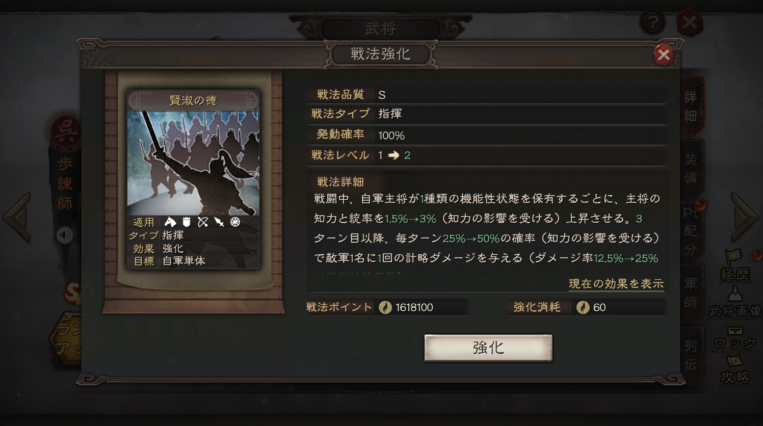 固有戦法「賢淑の徳」は、主将の機能性状態の数に応じて計略ダメージを与えることができ、部隊内の重要なダメージソースとなる。