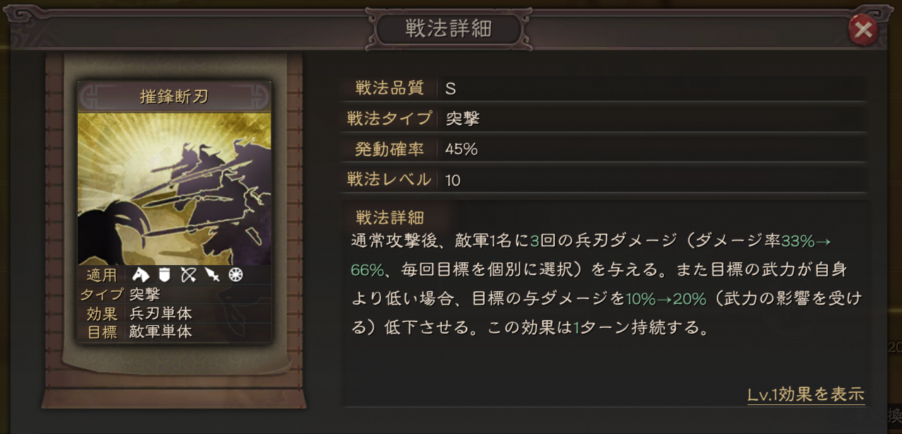 通常攻撃後、敵軍1名に3回の兵刃ダメージ(ダメージ率33%→66%、毎回目標を個別に選択)を与える。また目標の武力が自身より低い場合、目標の与ダメージを10%→20%(武力の影響を受ける)低下させる。この効果は1ターン持続する。