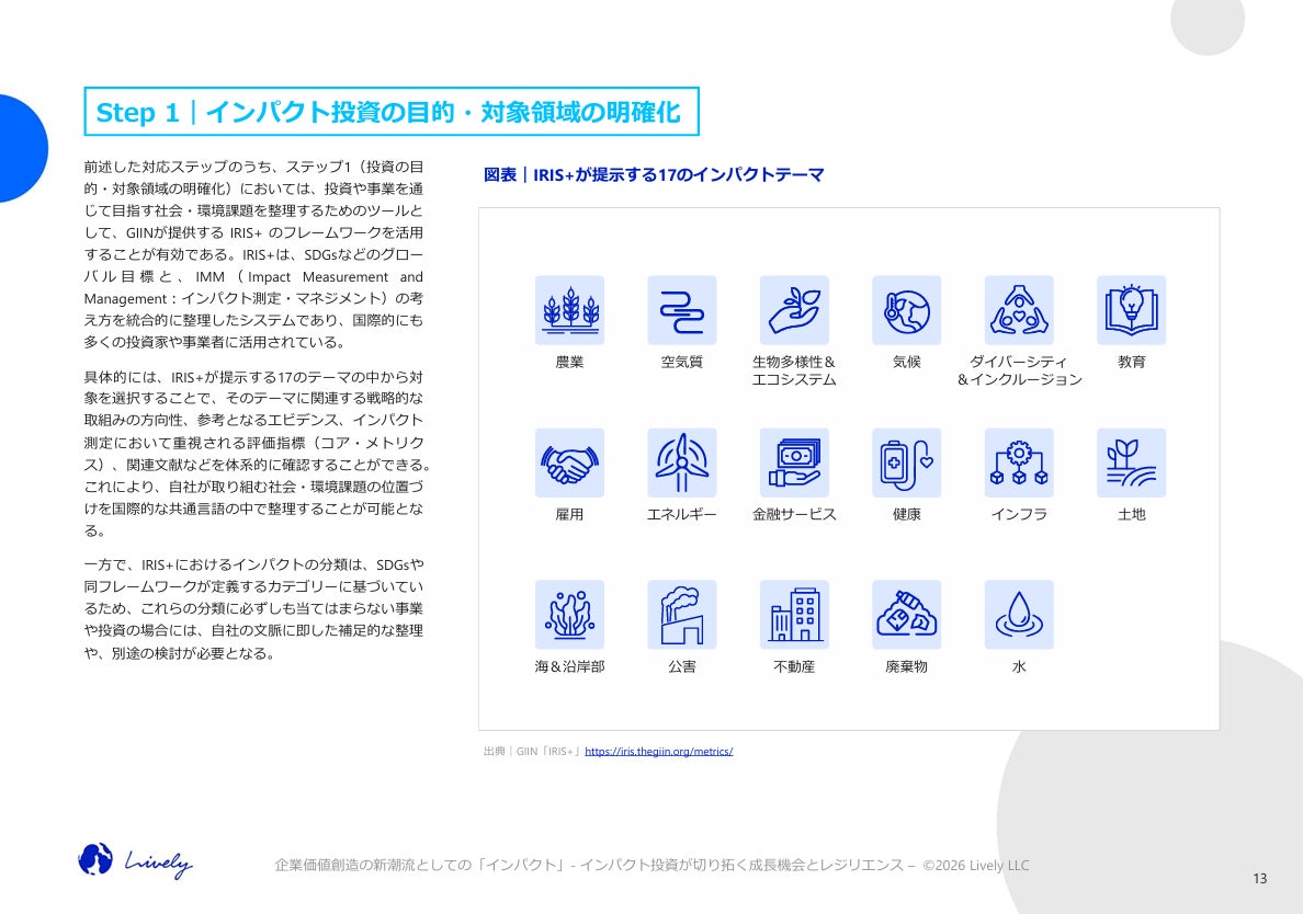 Lively合同会社(本社:東京都千代田区、Founder & CEO:種田 毅、Co-Founder & Co-CEO:三浦 友見)は、サステナブルな未来に向けたビジョンと先見力を育むことを目的としたレポート・シリーズ、第7弾となるレポート「企業価値創造の新潮流としての『インパクト』 インパクト投資が切り開く成長機会とレジリエンス」を、Livelyの公式ウェブサイトにて公開しました。
