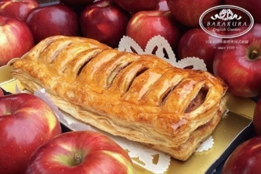 蓼科高原 バラクラ イングリッシュ ガーデン(バラクラ)のロングセラーのアップルパイが登場。りんごの果皮をつけたまま肉厚にカットして煮込み、まるごと2個のりんごが入るように長方形(ストウルーデル)となってます。パイが口の中でくずれる食感を味わっていただけるよう手作りの生地を何層にも折り込んでいます。りんごは長野県立科町の契約農家生産のものを使用しています。