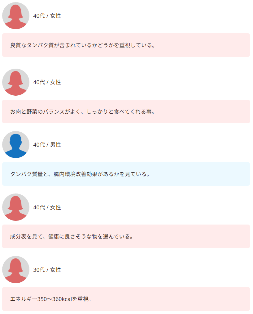 栄養バランスを意識してフードを選んでいる飼い主さんからは、お肉や野菜の組み合わせ、腸内環境への配慮など健康を重視する傾向が見られました。