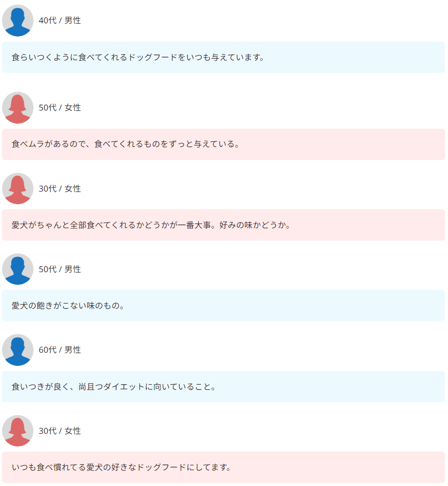 「愛犬が美味しそうに食べてくれること」を重視する飼い主さんの声が多く寄せられました。
