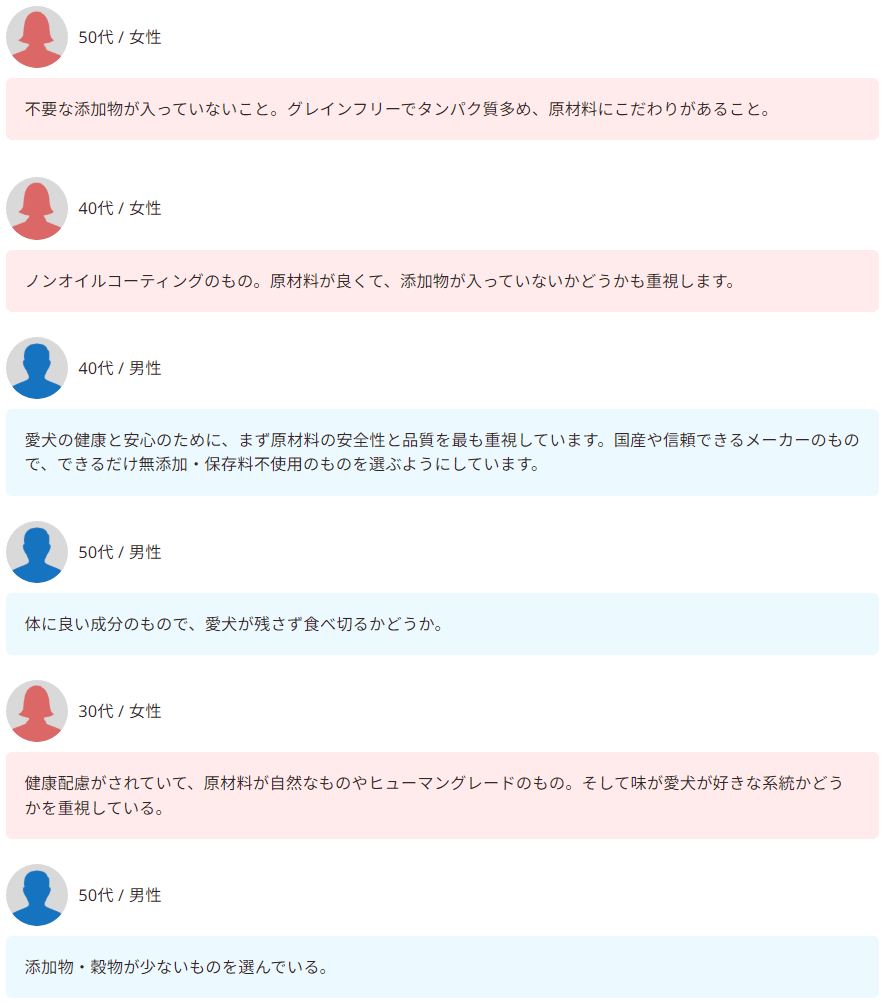 【質問】愛犬のドッグフードを選ぶときに、あなたが重視しているポイントやこだわりを自由に教えてください。