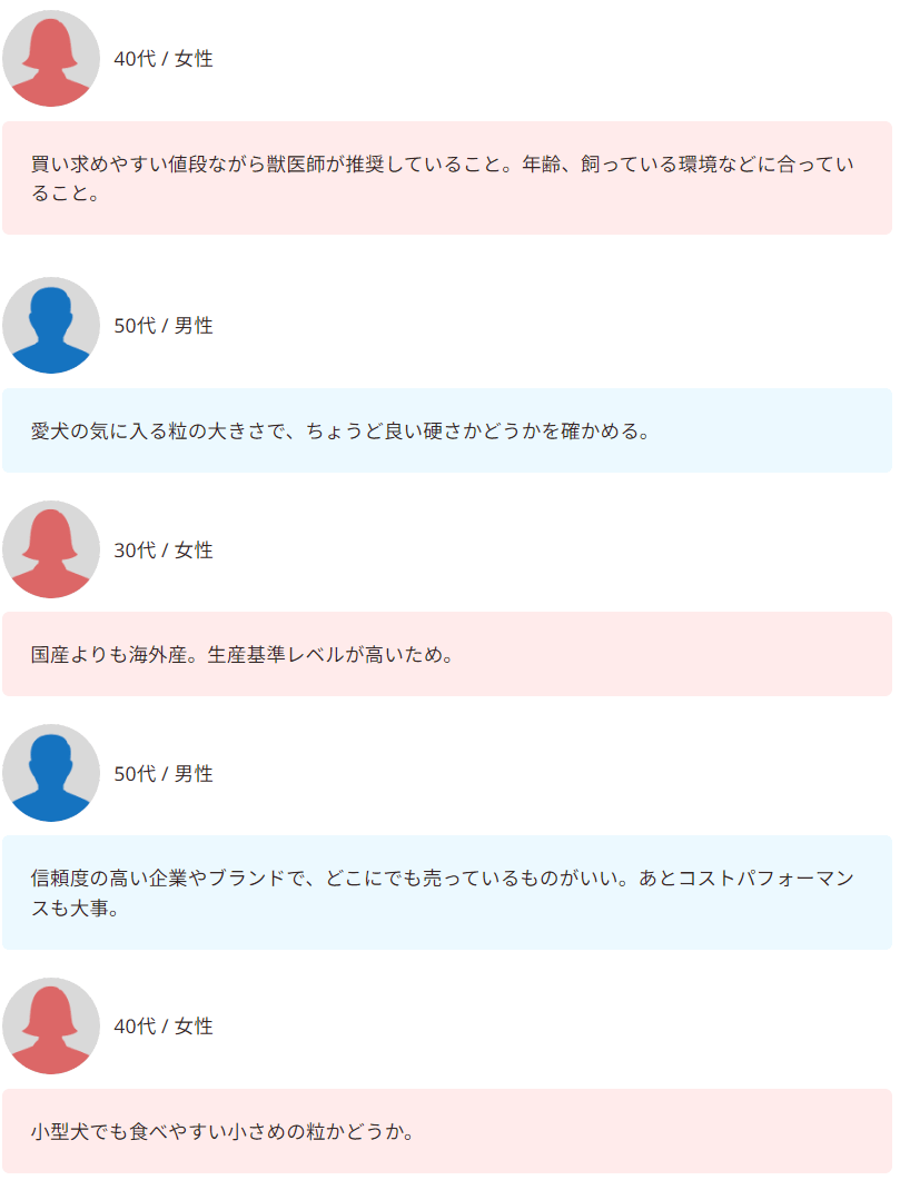 また、単なる価格よりも“品質とのバランス”を重視する傾向や、小型犬ならではの「粒の大きさ・形状」にこだわる声も目立ちました。