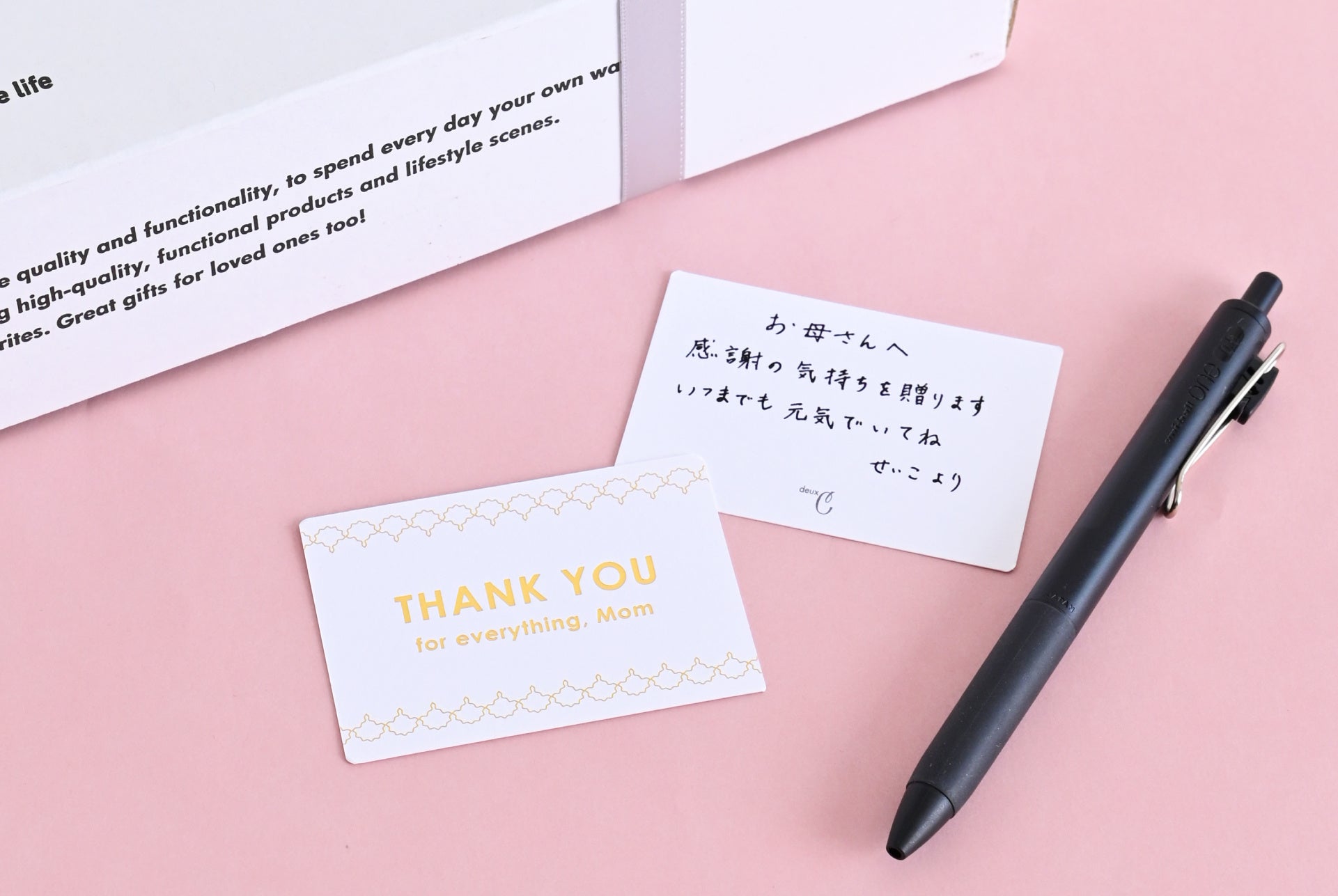 また、お母さんへ感謝の気持ちを伝えるプラスワンのサービスとして、無料のメッセージカードもご用意しております。「THANK YOU for everything, Mom」のメッセージには箔押し加工で華やかさを演出し、そのままギフトに添えても、裏面に手書きのメッセージを書くことも可能です。ぜひ一言添えられてみてはいかがでしょうか。