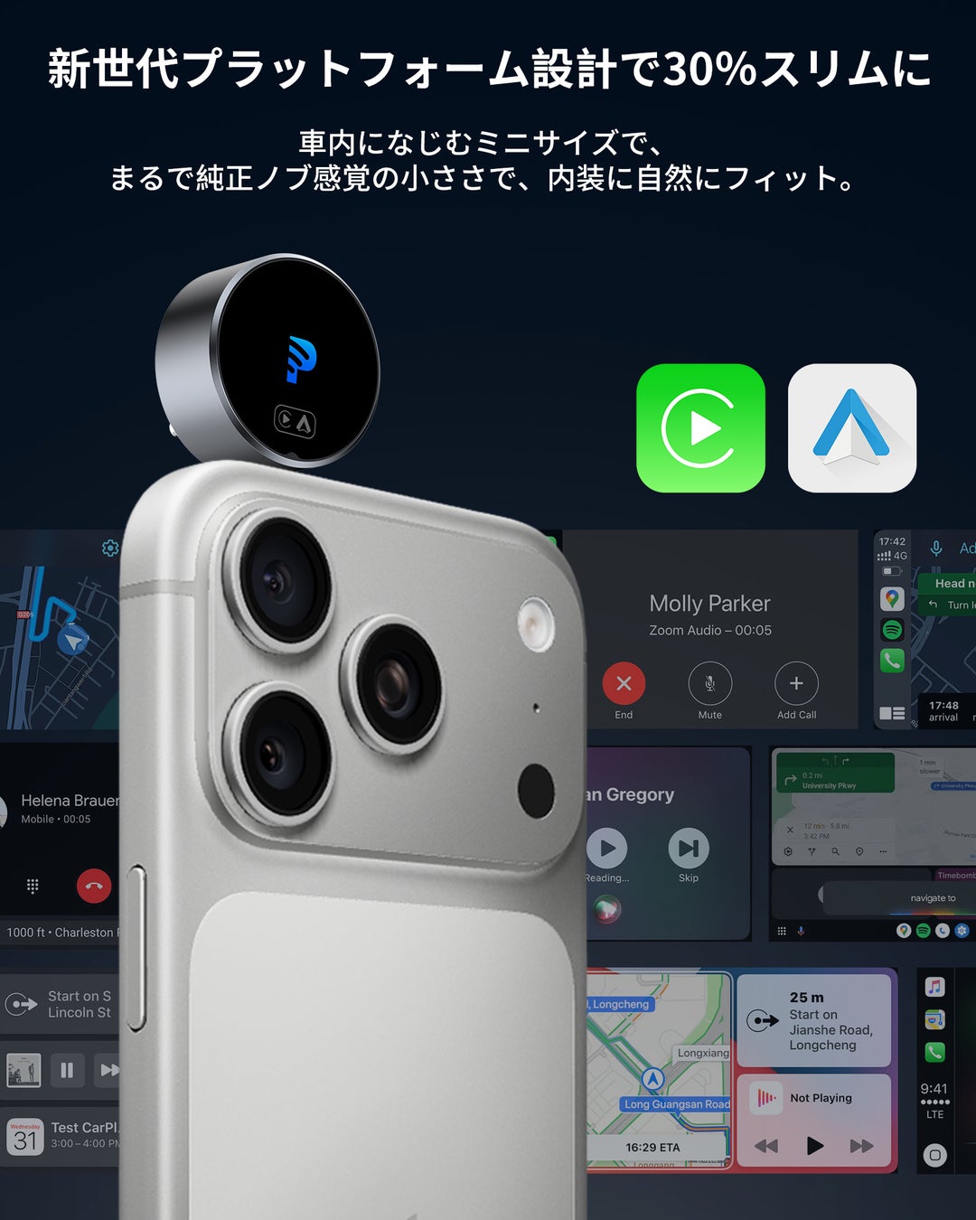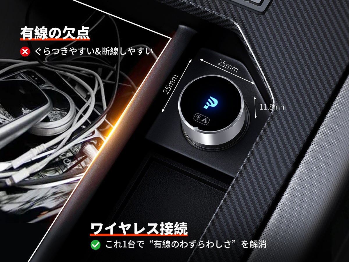 車両のUSB-Cポートに接続するだけで、有線CarPlay / Android Autoを無線化。