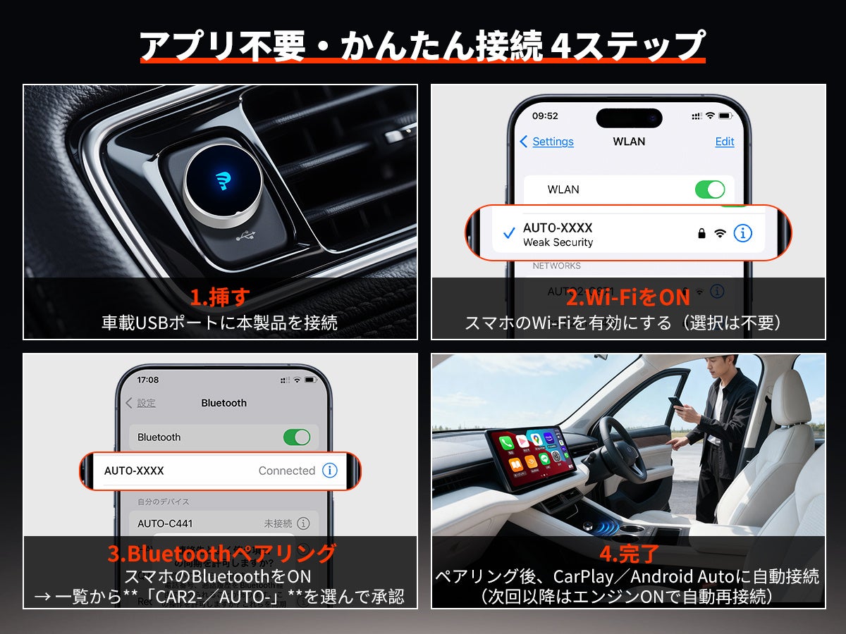 USB-Cポート搭載車にそのまま接続、初回設定後は次回から自動接続。面倒な準備なしで毎日の運転がすぐ快適に変わる新しいワイヤレス体験