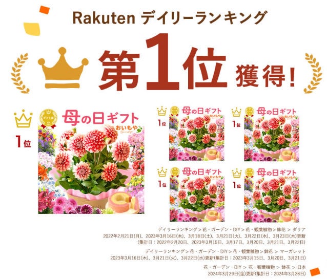 同シリーズは昨年、母の日ギフトとして約15,000鉢を完売するなど多くの支持を集めています。楽天市場においてもデイリーランキングで1位を獲得するなど、継続的な人気を得ています。