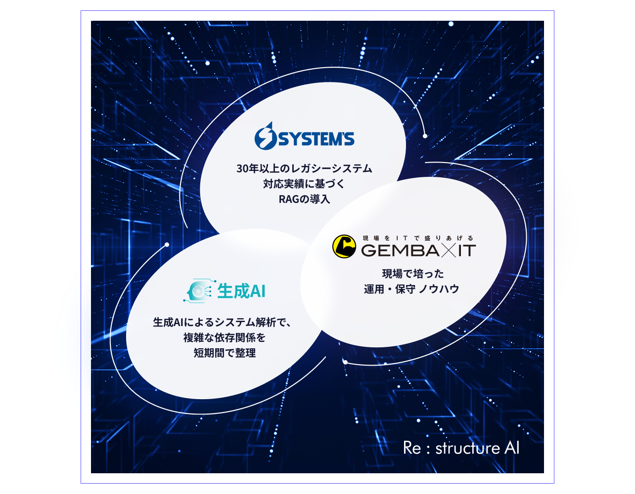 こうした課題を根本から解決するために、システムズは、生成AIと長年のマイグレーション支援の知見を融合させ、ブラックボックス化したレガシーシステムを再生するサービス「Re:structure AI」(リ・ストラクチャー・エーアイ)を開発しました。