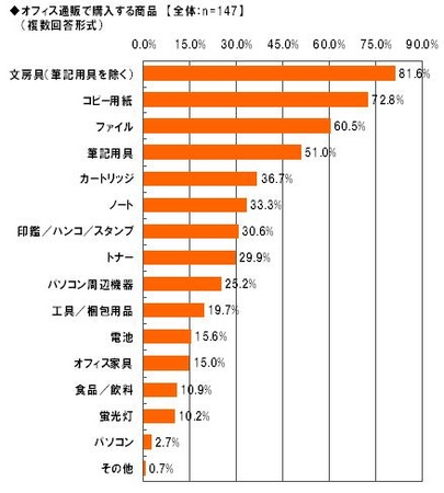 オフィス通販の利用者に対し、オフィス通販でよく購入する商品について聞いたところ(複数回答形式)、1位「文房具(筆記用具を除く)」81.6%、2位「コピー用紙」72.8%、3位「ファイル」60.5%、4位「筆記用具」51.0%、5位「カートリッジ」36.7%となりました。