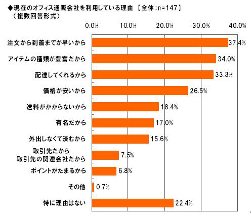 次に、同回答者にオフィス通販を利用している理由を複数回答形式で尋ねたところ、1位「注文から到着までが早いから」34.7%、2位「アイテムの種類が豊富だから」34.0%、3位「配達してくれるから」33.3%という結果になりました。また、「特に理由はない」と回答した人も22.4%となっており、オフィス通販会社に求める基本的な利便性が満たされれば、他に特定のこだわりはないということが明らかとなりました。