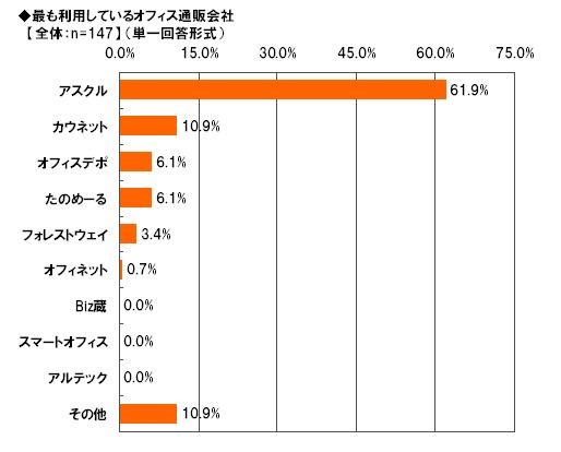 オフィス通販利用者(147名)に最も利用しているオフィス通販会社を聞いたところ、61.9%が「アスクル」と回答し2位以下を大きく引き離してトップとなりました。2位は「カウネット」10.9%、3位は同率で「オフィスデポ」、「たのめーる」6.1%となっています。
