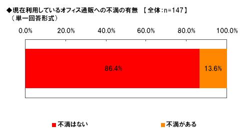 オフィス通販利用者に対し、オフィス通販への不満があるかどうかを尋ねたところ(単一回答形式)、86.4%が「不満はない」と回答し、「不満がある」と回答したのは13.6%にとどまりました。