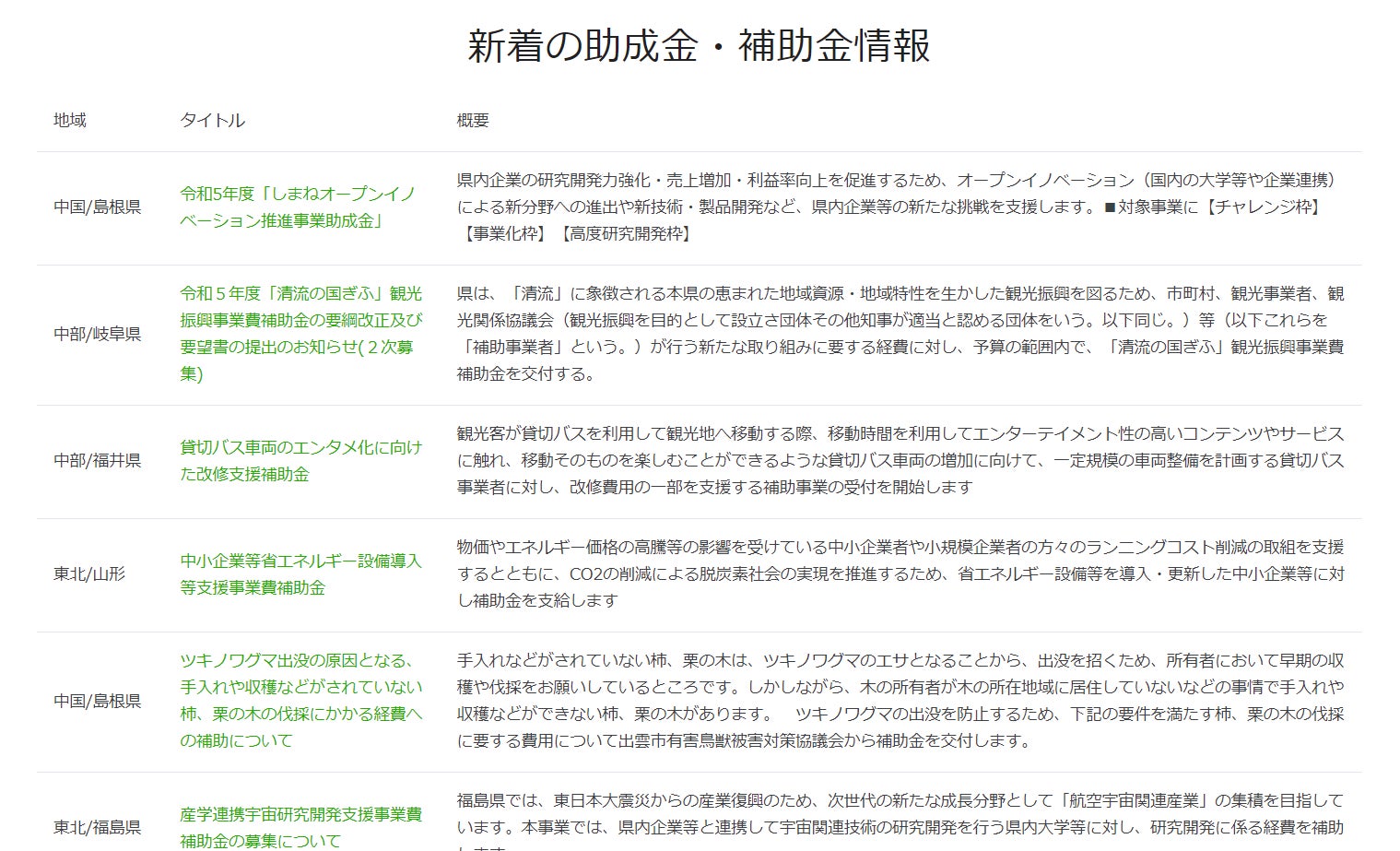 のような、地域密着型の補助金・助成金情報を細かくチェックすることが可能です。