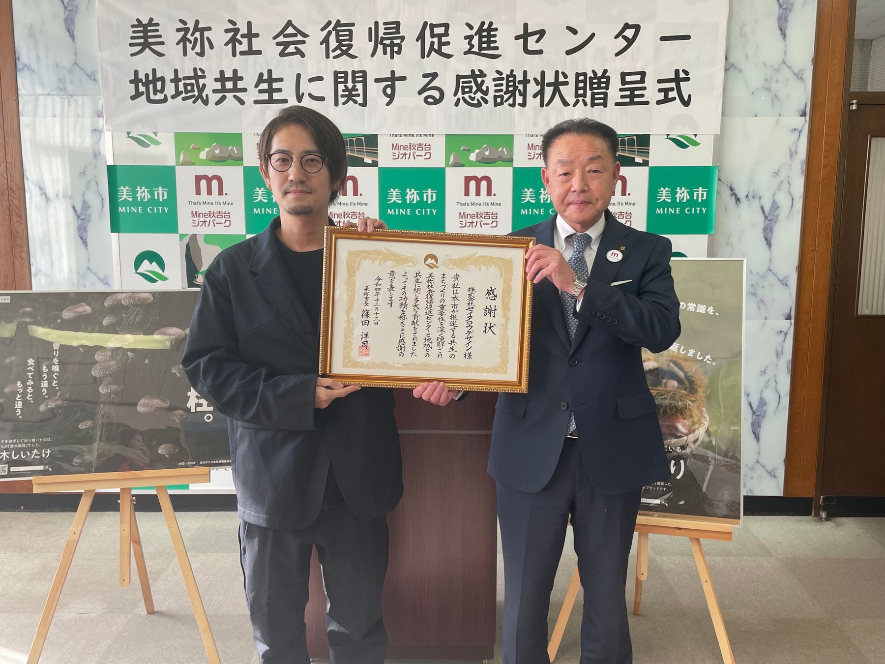 また、12月13日、昨年から実施した職業訓練「販売戦略科」(広告ポスターの制作)を通して、再犯防止・地域創生推進事業に積極的に参画し、受刑者の再犯防止に関する地域全体での取り組みに先駆的な役割を果たすとともに、美祢市が推進する共生のまちづくり及び地域経済の活性化にも多大な貢献をしたとして、美祢市役所にて、篠田 洋司市長より感謝状をいただきましたのでご報告させていただきます。