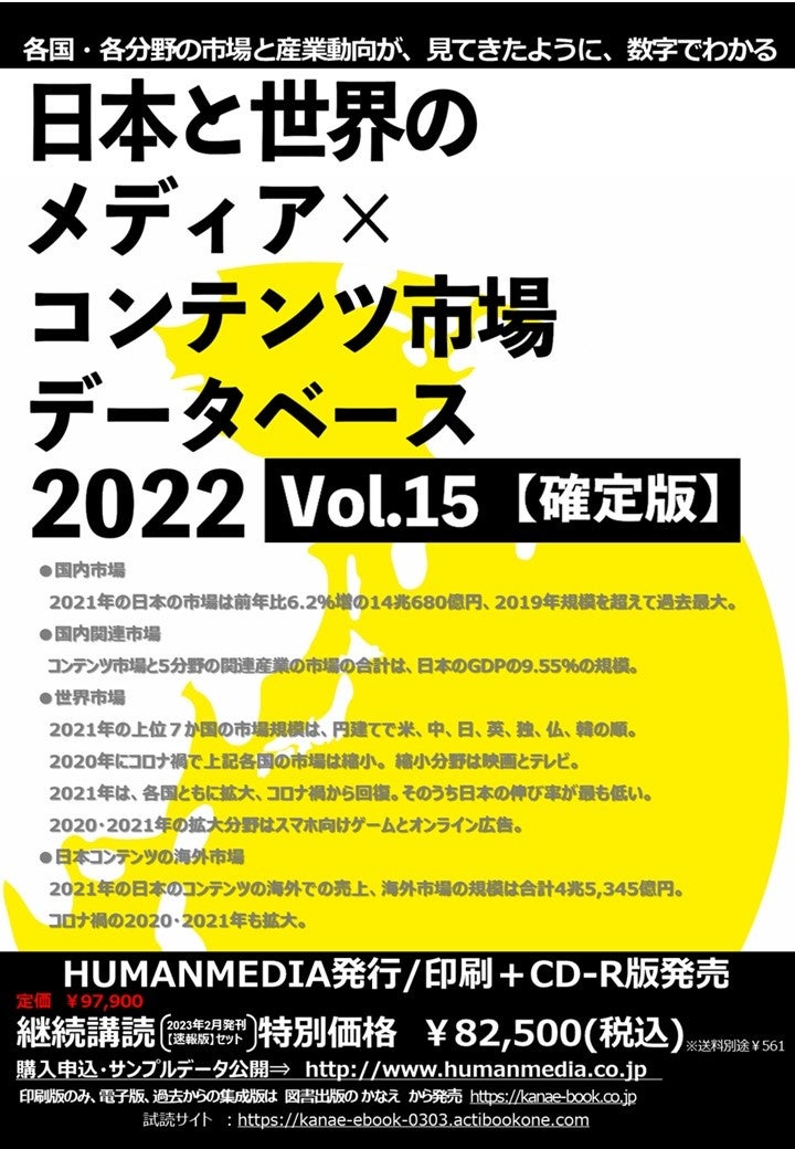 (株)ヒューマンメディア(本社:東京/代表取締役社長:小野打 恵)は、 2022年11月21日(月)に発刊した「日本と世界のメディア×コンテンツ市場データベース2022 Vol.15【確定版】」において、 2021年の世界の主要な国・地域のコンテンツ各分野の規模とこれを合計した市場規模を算出し、掲載した。