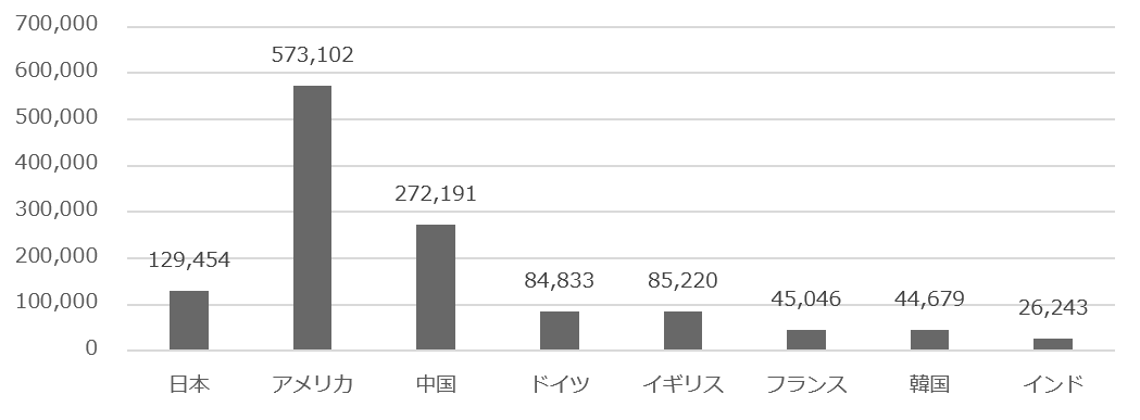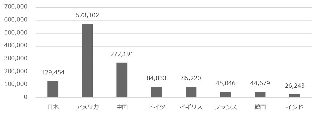円換算では上位8か国のうち中国、英国は前年比30%以上の拡大、米・独・仏・韓・印も10%以上の伸びとなったが、日本は6.55%の伸びにとどまった。2021年の円安傾向により、円建てでは海外各国の伸び率がより大きくなったが、ドル建てでも中国は28.53%、米・仏・印は10%以上の伸び、独が8.94%の伸びとなったが、日本は3.58%にとどまった。各国の現地通貨建てでは中国が17.29%、仏は7.33%、独は5.13%の伸びとなり、印はマイナスであった。2019年比では、米はドル建てで11.22%と回復、拡大、中国は元建てで25.37%と大幅拡大、独はユーロ建てで6.02%の拡大、日本は円建てで4.73%のにとどまり、仏はユーロ建てでわずかに届かず、印はルピー建てでは5%以上減少したままだった。