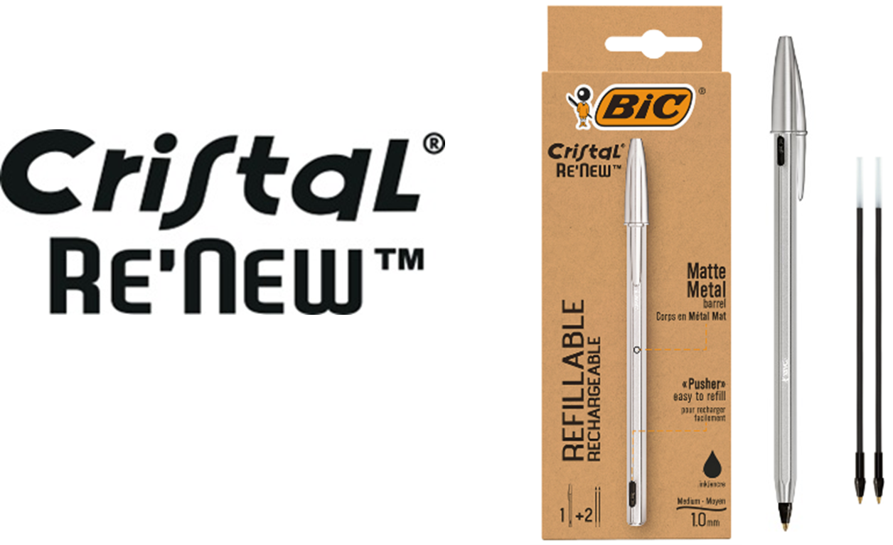 BICボールペンのアイコンともいうべき「ビック・クリスタル」は、1950年に“世界初の使い切りボールペン”として誕生しました。シンプルなデザインと価格、滑らかでにじまない書き心地の良さから、瞬く間に「定番のボールペン」として浸透し、70年以上にわたって世界中の人々に愛され続けています。その定番シリーズから初のプレミアムラインとして、「クリスタル Re'New 1.0㎜」が日本に初上陸します。質感とデザイン性に優れたアルミ製ボディは、見た目の高級感を演出しているだけでなく、芯を替えることができる“リフィラブル”仕様を採用。キャップやパッケージにも環境に優しいエコ素材を使用しています。