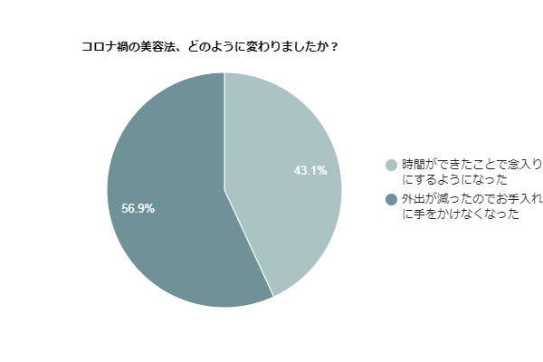 もちろん、「時間ができたことで念入りにするようになった」と答えた人も43%と多くいます。念入りにするようになったと答えた人は、せっかくのコロナ禍でメイクアップなどでなく体の内側からきれいになろう!と考えている人が多くいる印象です。