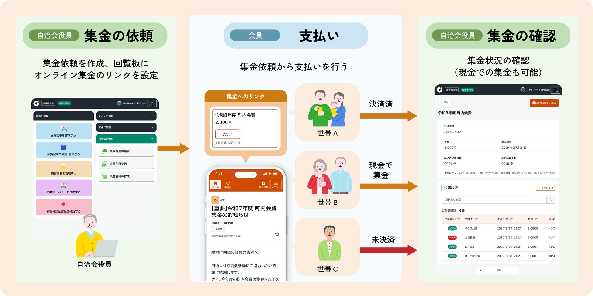 「集金補助・世帯管理機能」は、自治会業務の中でも特に負担が大きい「会費集金業務」を効率化するために開発された機能です。
